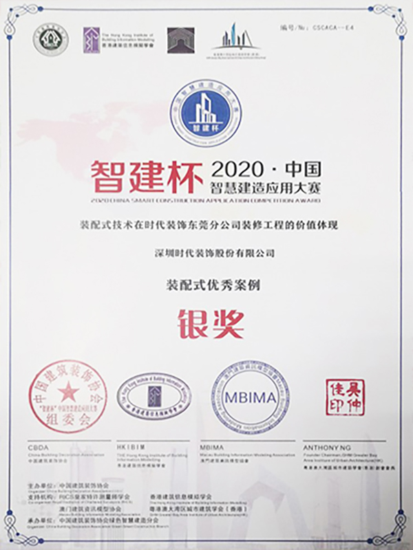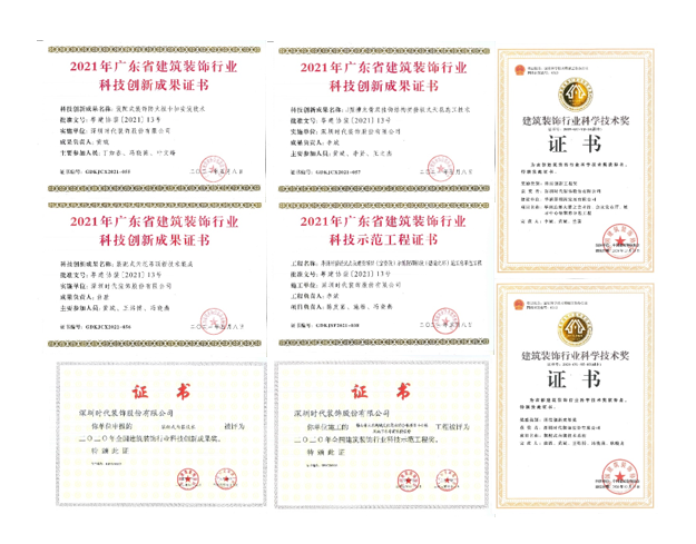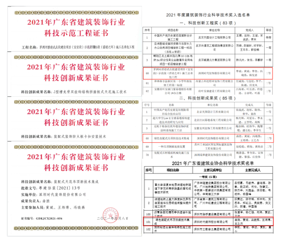 1、公司獲獎:時代注重科技創效,為提升項目施工效率及品質,積極采用新工藝、新工法等,其中我司承建的茅洲河碧道試點段建設項目(寶安段)示范段Ⅷ標段(碧道之環)施工總承包工程榮獲2021年度建筑裝飾行業科學技術獎——科技創新工程獎及廣東省建筑裝飾行業科技示范工程獎;綠色裝配式吊頂快裝技術集成榮獲2021年度建筑裝飾行業科學技術獎——科技創新成果獎,及2021年廣東省建筑業協會科學技術進步獎三等獎;自主研發的J型槽龍骨雙掛鉤結構拼接板式天花施工技術、裝配式裝飾防火板卡扣安裝技術和裝配式天花吊頂新技術集成3項成果均獲評2021年廣東省建筑裝飾行業科技創新成果獎。